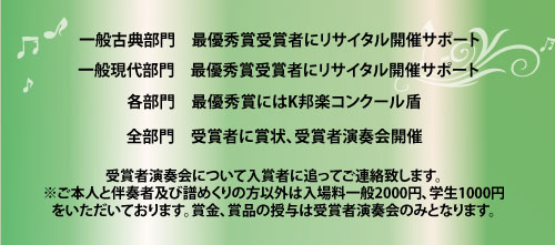 自由。 自作曲は認めません。各部門 応募者の演奏は暗譜。